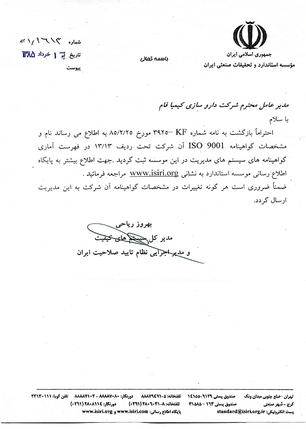 در خرداد 1385، گواهینامه ISI 9001 شرکت دارویی کیمیافام، توسط موسسه استاندارد و تحقیقات صنعتی ایران در فهرست گواهینامه های سیستم مدیریت ثبت گردید.