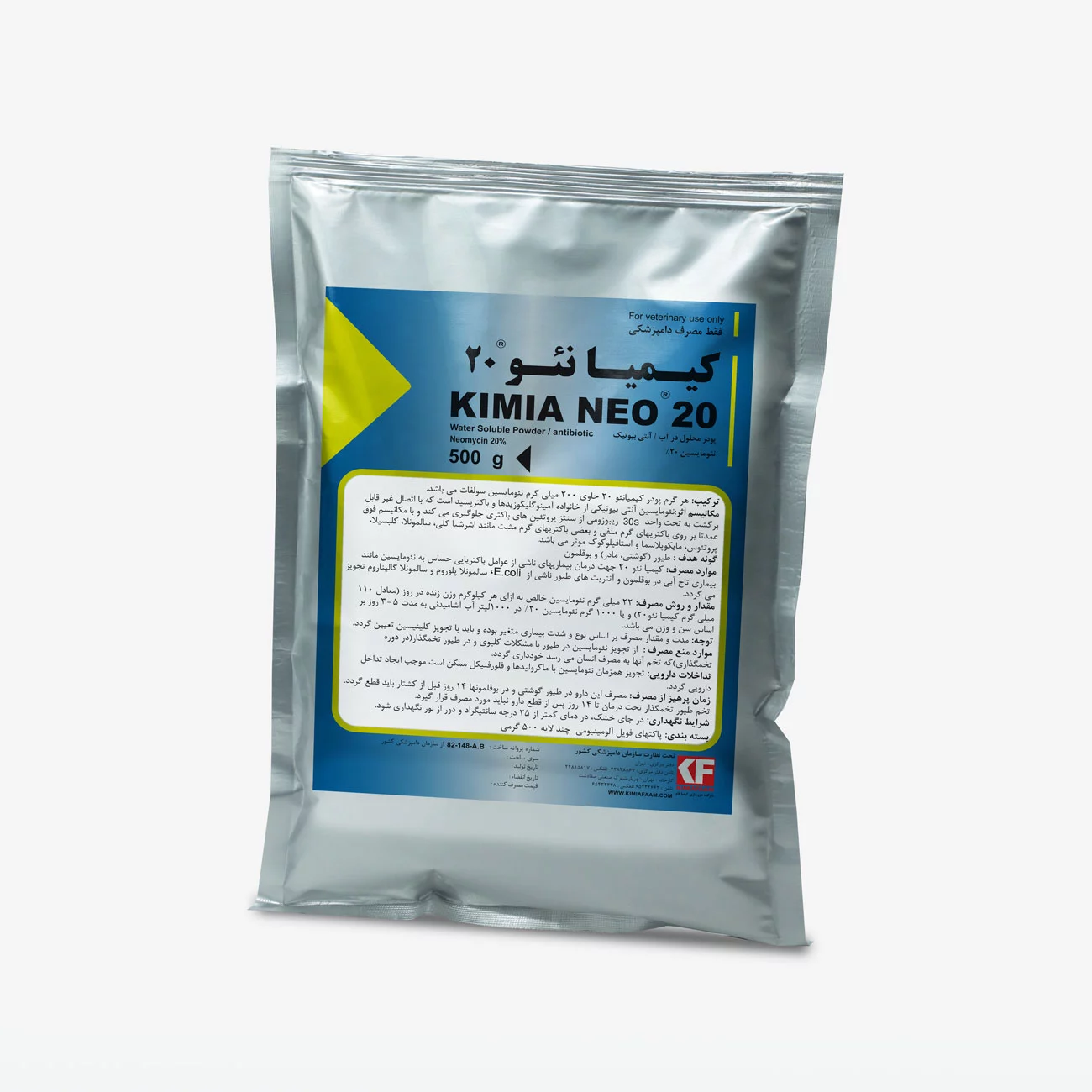 هر گرم پودر کیمیا نئو 20 حاوی 200 ميلیگرم نئومايسين سولفات میباشد.